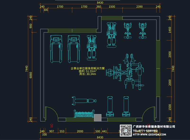 此方案要求面积小于51m²,适用于企事业单位、酒店会所、楼盘社区、学校、私教工作室、家庭等健身场所,能满足8-15人同时健身使用。(方案根据场地空间大小、预算、产品需求等进行配置仅为启发性参考)