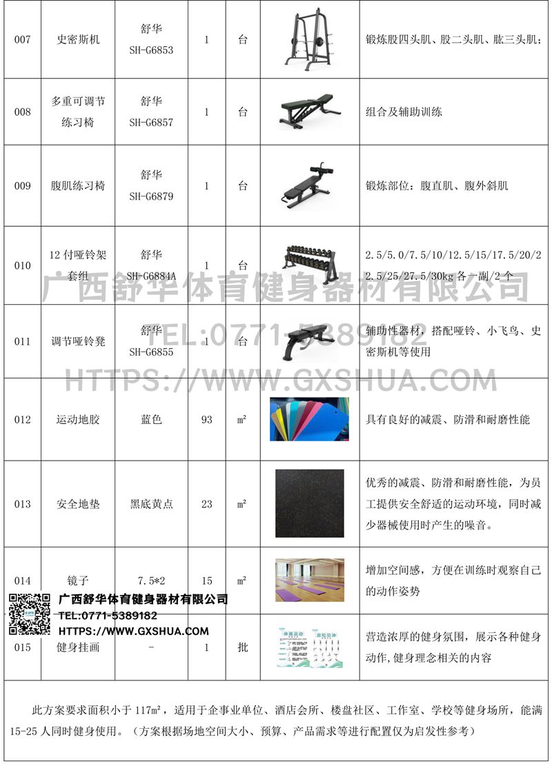 此方案要求面积小于117m²,适用于企事业单位、酒店会所、楼盘社区、工作室、学校等健身场所,能满15-25人同时健身使用。(方案根据场地空间大小、预算、产品需求等进行配置仅为启发性参考)