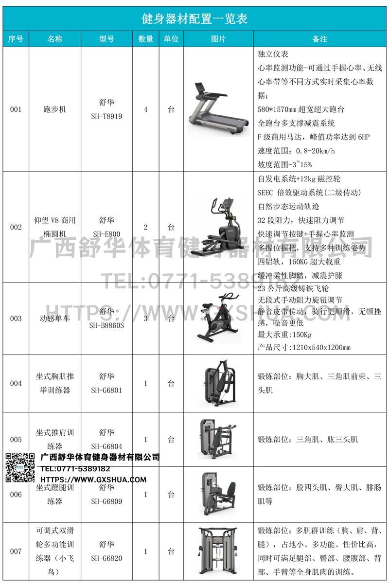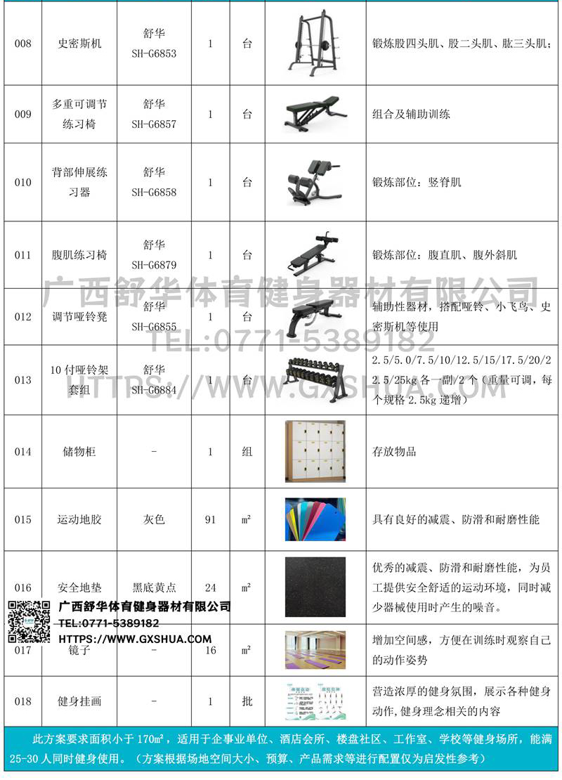 小飞鸟(1台)、史密斯机1台)多重可调节练习椅1台)、罗马椅(1台)、腹肌板(1台)、10付哑铃套组(1套)、哑铃凳(1台),可以实现对不同肌肉群的针对性训练,满足肌肉训练需求,全方位激活身体机能。