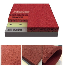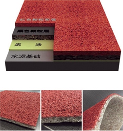 1、上层为PU颗粒或EPDM耐候性环保彩色颗粒,渗水的聚氨酯密封,下层采用机械施工缓冲底垫,符合比赛标准。